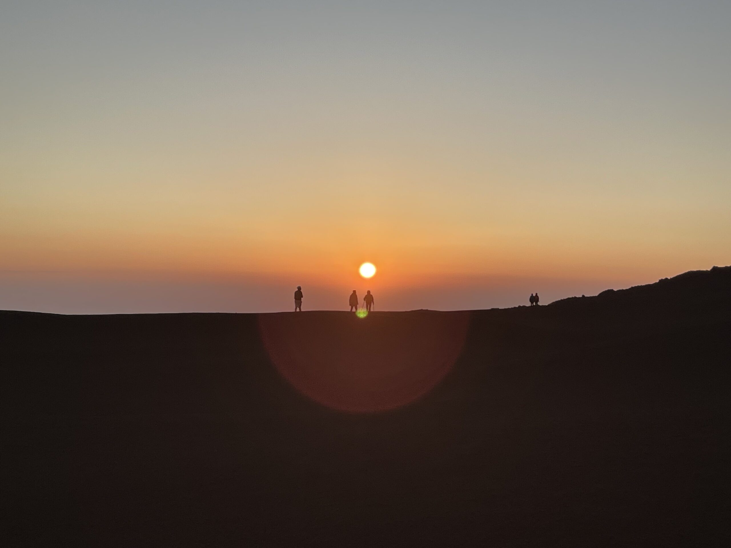 Arrival at a panoramic point near a lateral crater, perfectly positioned to admire the sunset over the western horizon. Time for photos, silence and observation as the light gradually transforms the volcanic terrain.