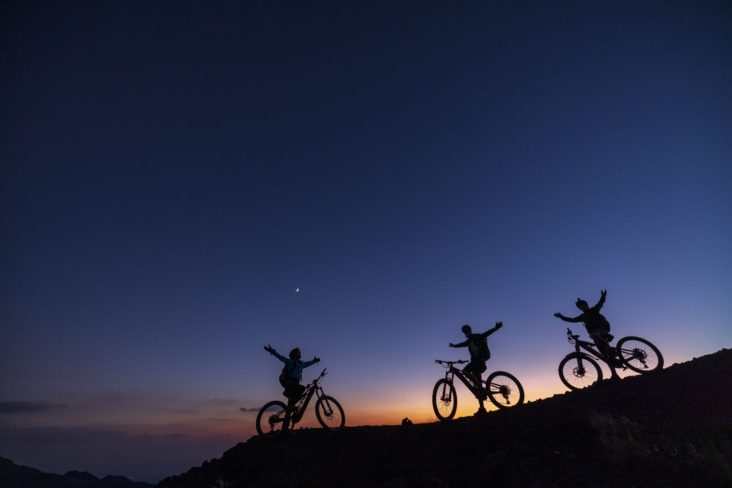Twilight descent under the stars, returning in darkness guided only by e-bike lights and the night sky